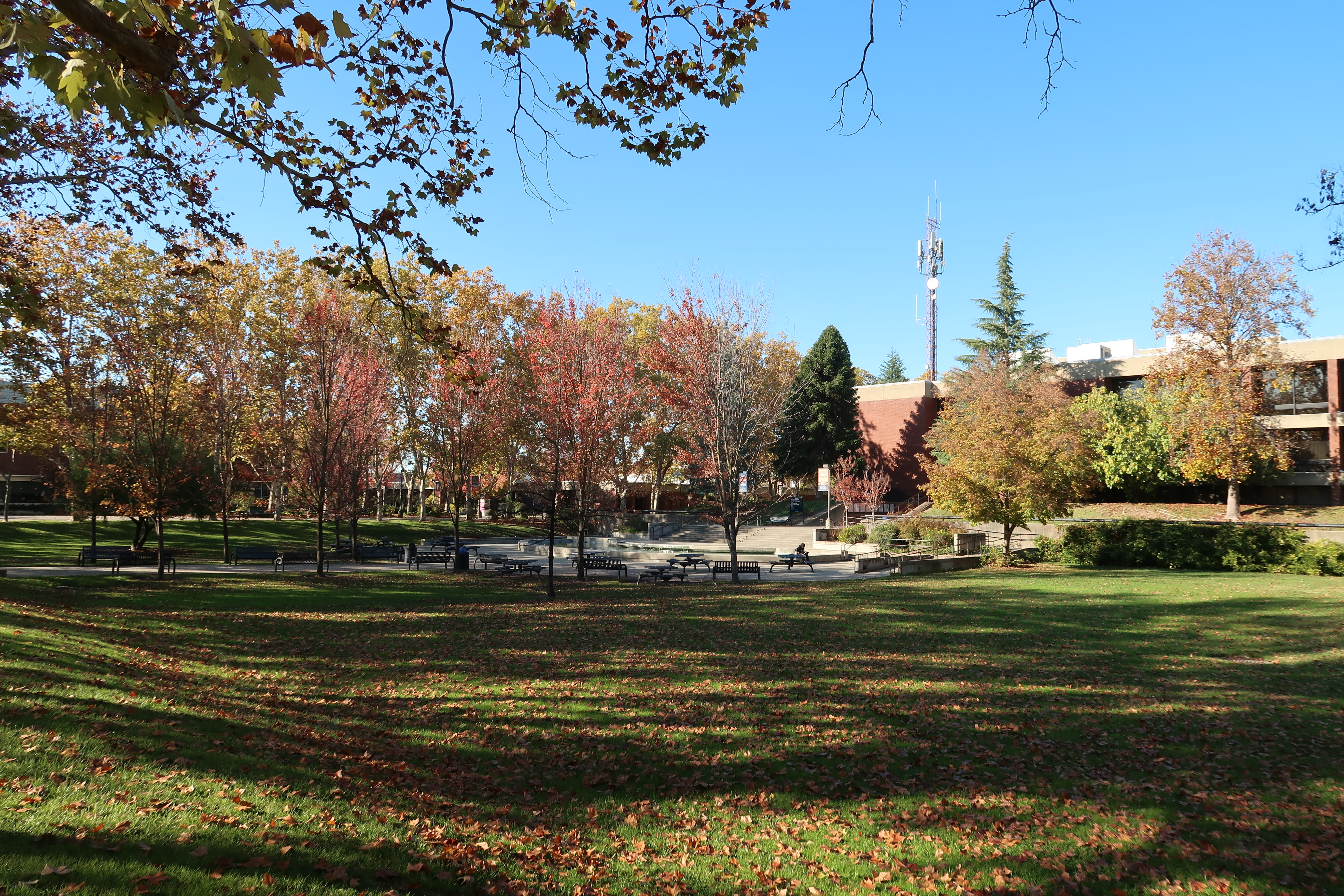 View of the green, the fountain, and the library. 2025-11-21