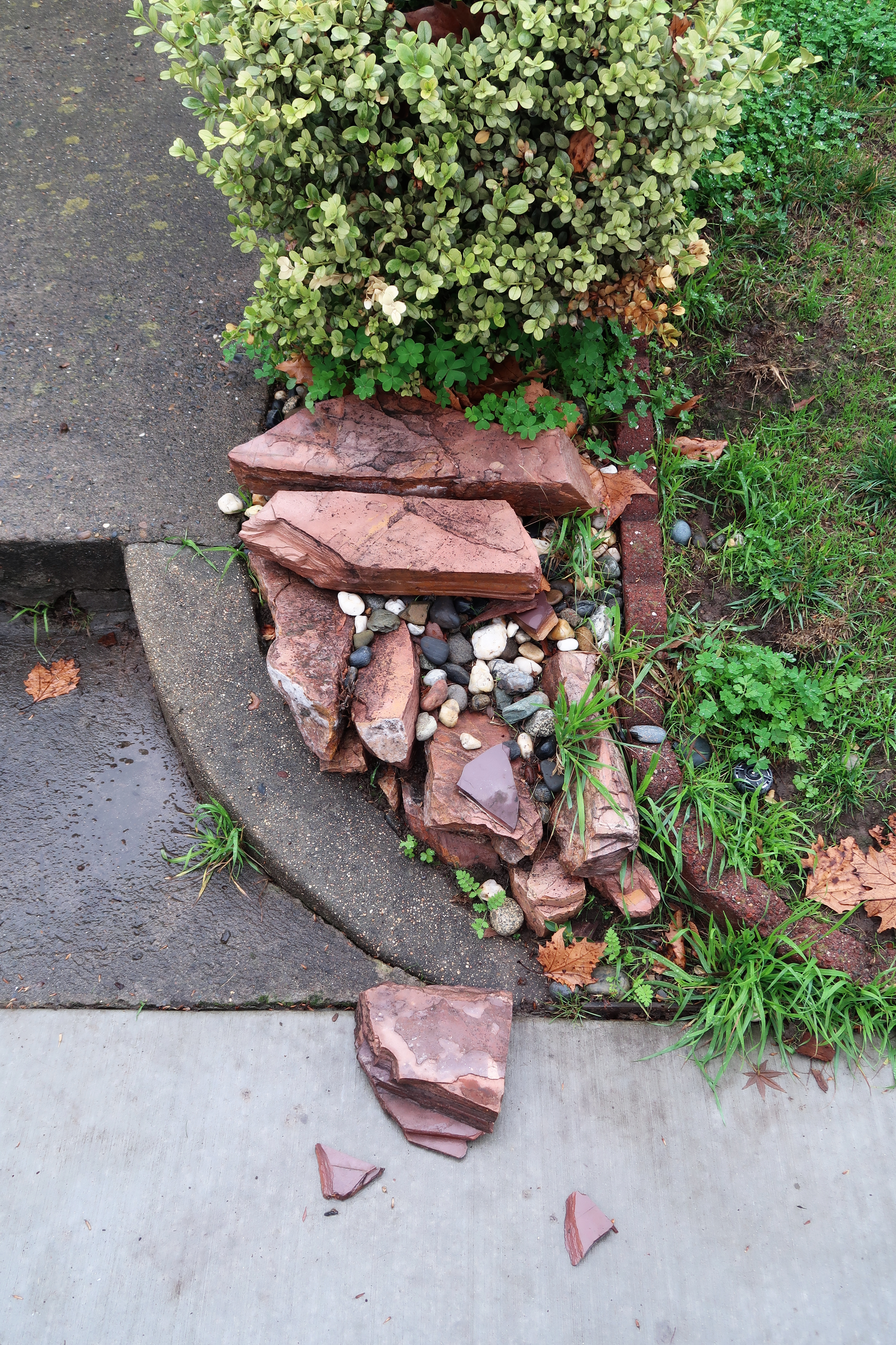 Pavement, curb, irregular rocks, and greenery. 2024-12-21