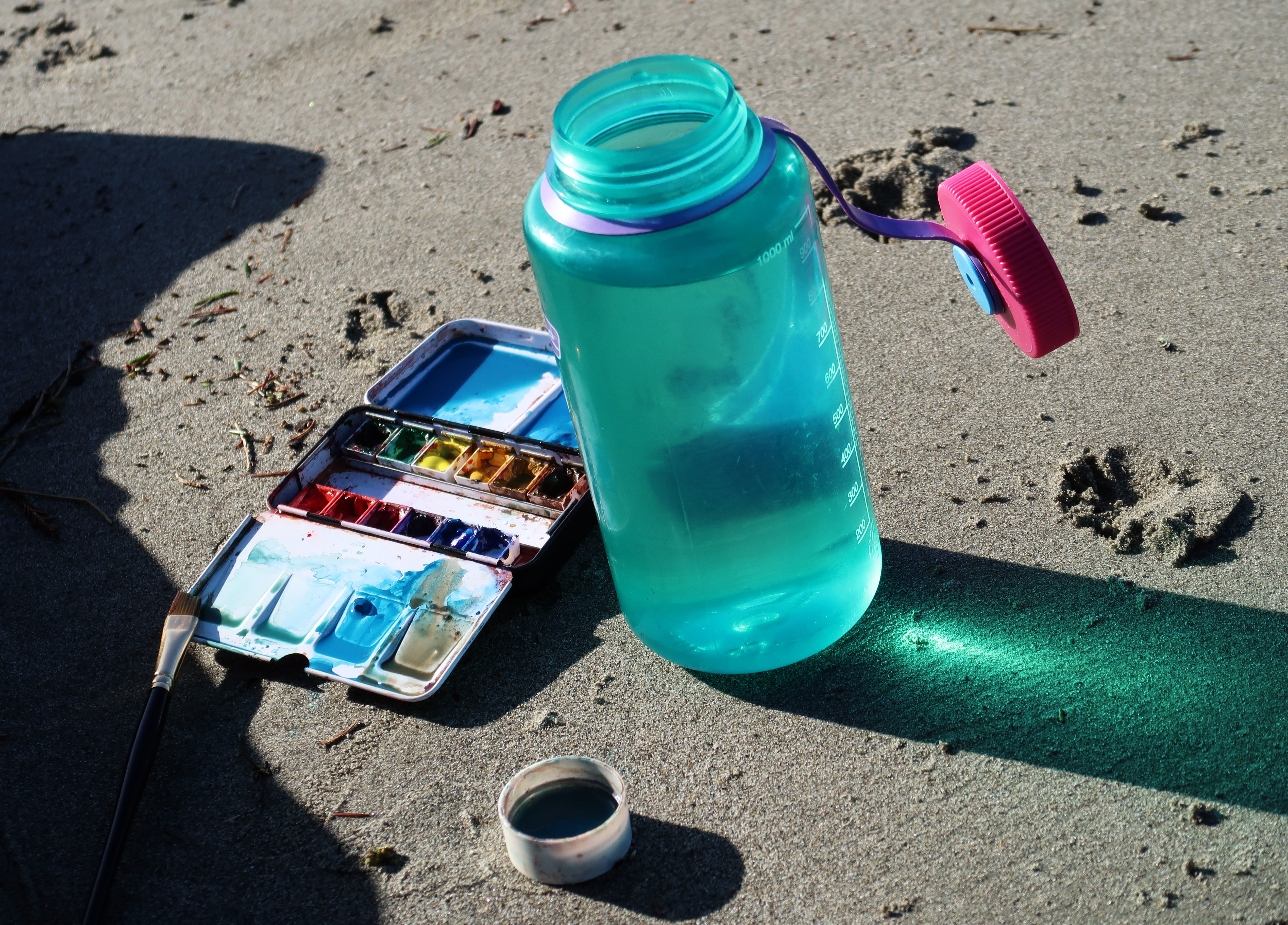 Paints and a water bottle on a beach. Краски и бутылка на пляже. 2024-12-24