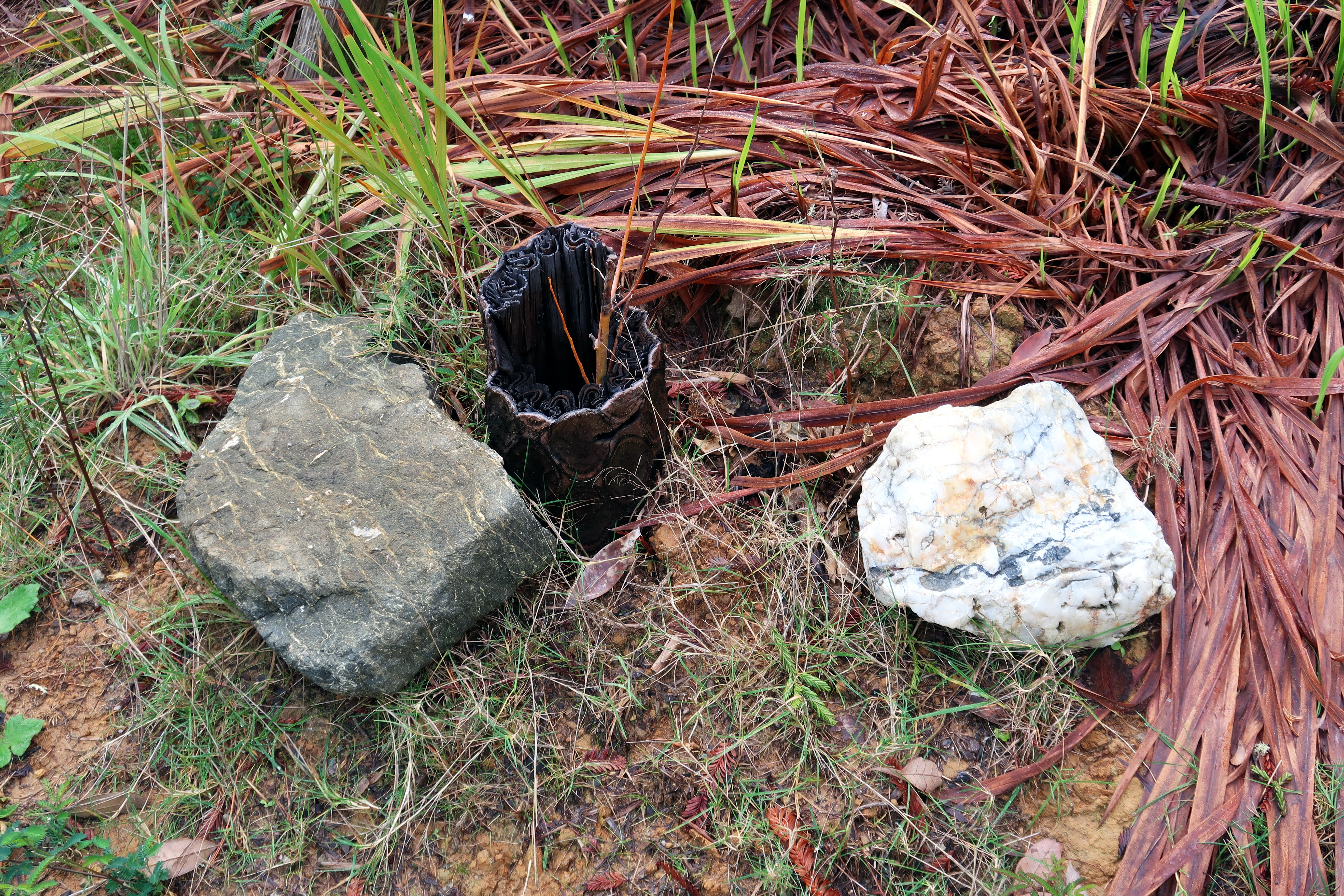 Two rocks and an empty trunk in a garden setting. 2024-12-25
